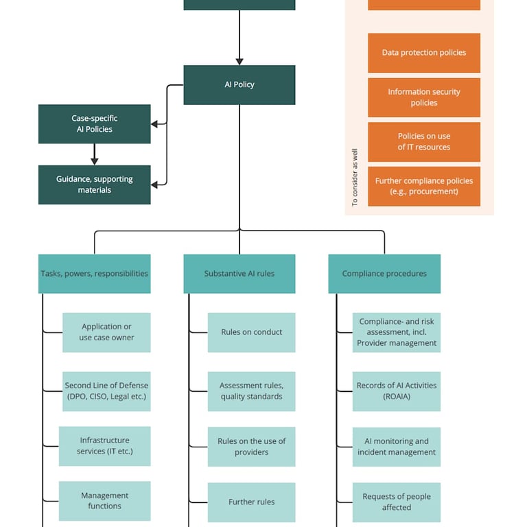 Phase 2 of Governance Setup establishes necessary organizational structures and policy frameworks, including constitution of an AI Governance Committee with cross-functional representation, development of an AI Policy articulating principles and requirements, implementation of a Data Governance Framework with clear RACI roles, and definition of standardized Risk Assessment Protocols.